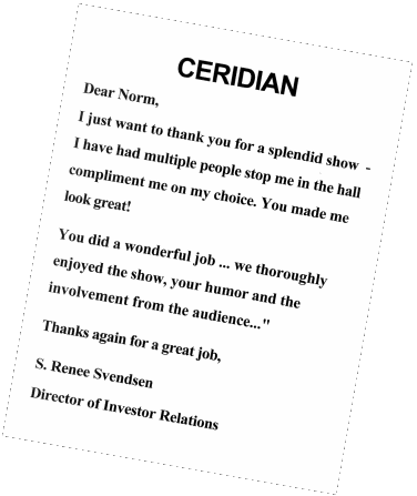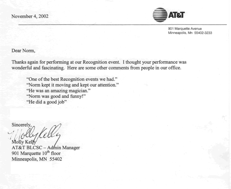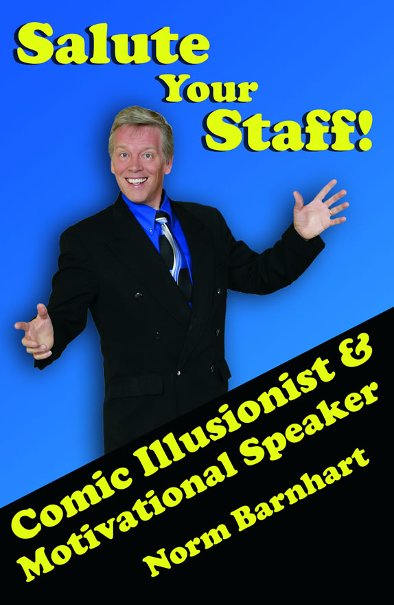 "Our staff truly enjoyed the "Team Work" show. I highly recommend it to any business meeting to help create a bond within the company." Shinya McHenry - Owner The Dancer's Studio "It was a great program with a positive spin on the importance of service. You received rave reviews..." Michael Erickson - City Administrator Watertown, MN "The entire presentation was very effective in combining education and entertainment. He very creatively combined his magic act while he spoke on the importance of service." From the Newsletter of the National Association of Fleet Administrators Call Norm Barnhart: (651)257-7116 |